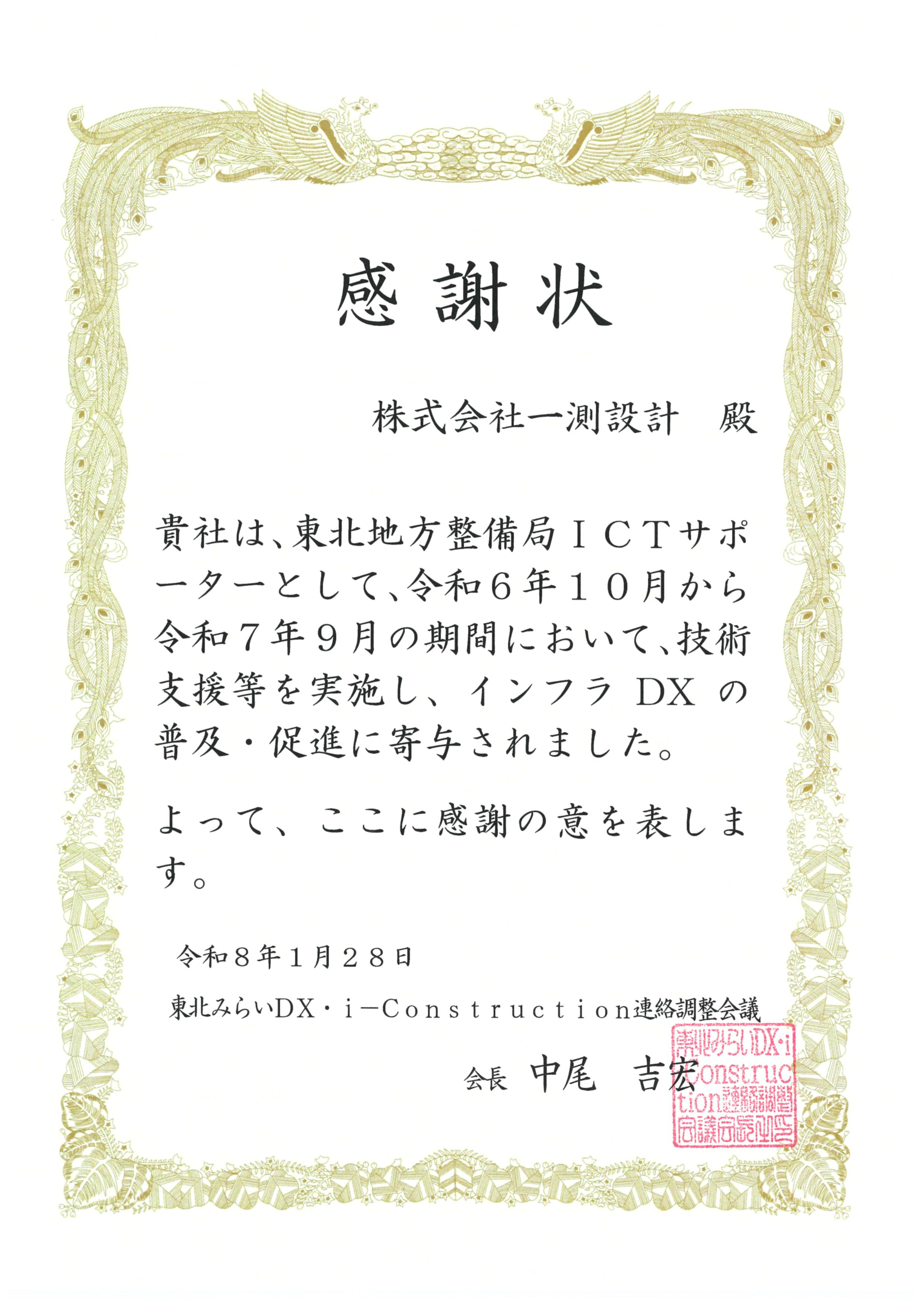 > 【東北地方整備局ICTサポーター】として感謝状をいただきました。